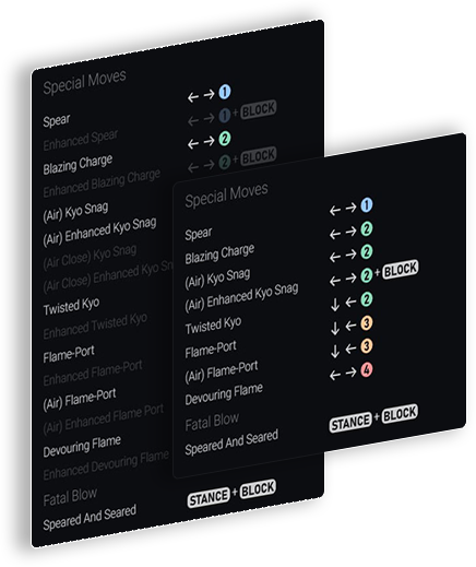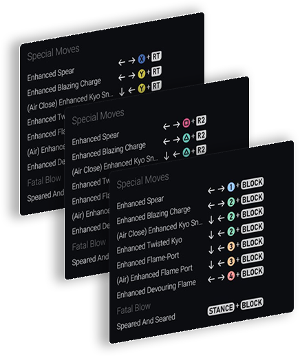 Move inputs can be displayed in Universal notation or based on your chosen platform (PlayStation, X-Box, Switch, PC).